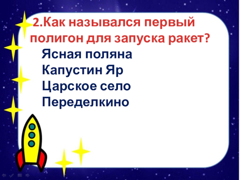 Слайд 4 2.Как назывался первый полигон для запуска ракет?