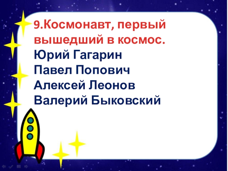 9.Космонавт, первый вышедший в космос.Юрий ГагаринПавел ПоповичАлексей ЛеоновВалерий Быковский