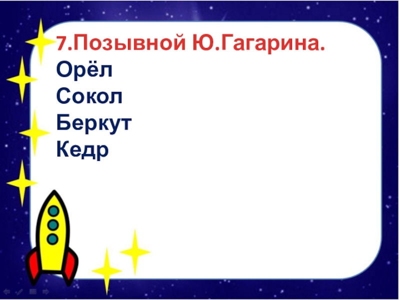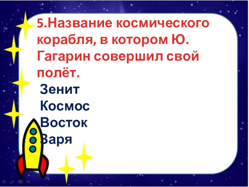 5.Название космического корабля, в котором Ю.Гагарин совершил свой полёт. Зенит Космос Восток Заря