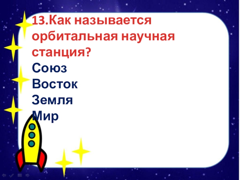 13.Как называется орбитальная научная станция?СоюзВостокЗемляМир