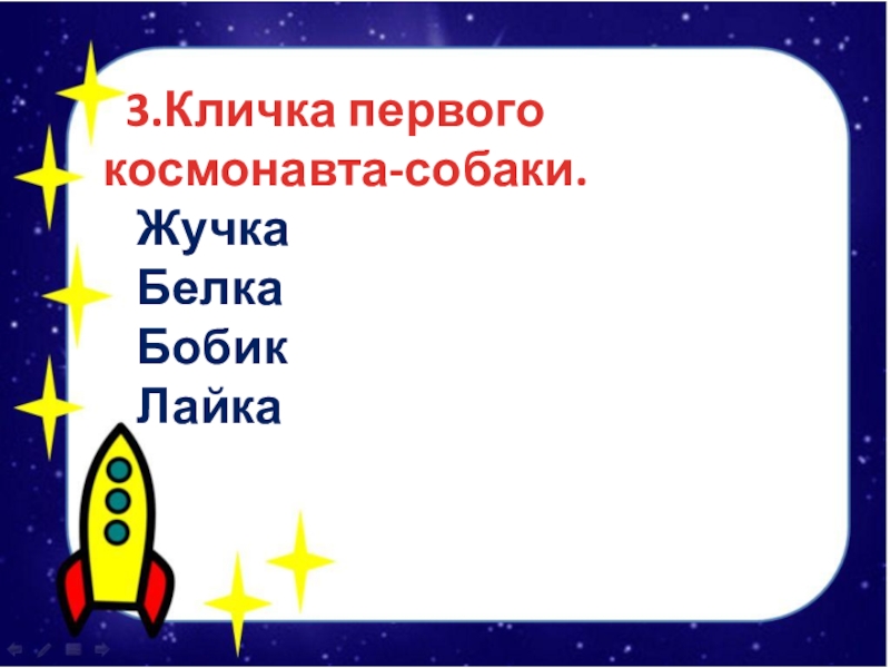 Слайд 5 3.Кличка первого космонавта-собаки.
