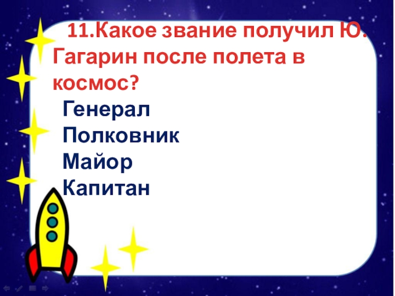 Слайд 13 11.Какое звание получил Ю.Гагарин после полета в космос?