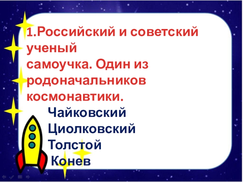 1.Российский и советский ученыйсамоучка. Один из родоначальников космонавтики.    Чайковский    Циолковский