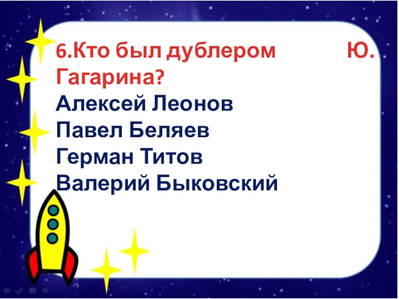 6.Кто был дублером       Ю.Гагарина?Алексей ЛеоновПавел БеляевГерман ТитовВалерий Быковский