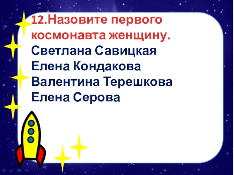 12.Назовите первого космонавта женщину.Светлана СавицкаяЕлена КондаковаВалентина ТерешковаЕлена Серова