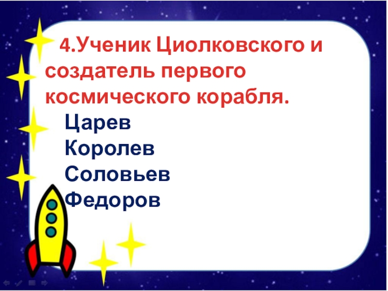 4.Ученик Циолковского и создатель первого космического корабля.  Царев  Королев  Соловьев  Федоров