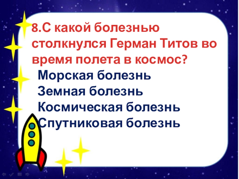 8.С какой болезнью столкнулся Герман Титов во время полета в космос? Морская болезнь Земная болезнь Космическая болезнь