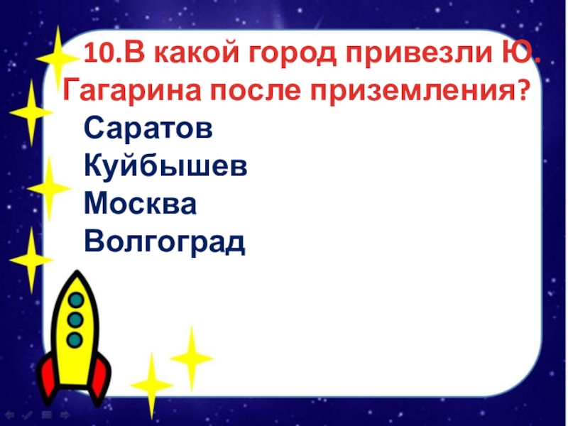 Слайд 12 10.В какой город привезли Ю.Гагарина после приземления?
