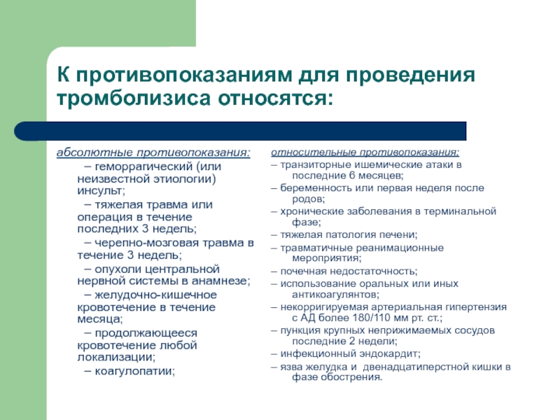 Слайд 17К противопоказаниям для проведения тромболизиса относятся: