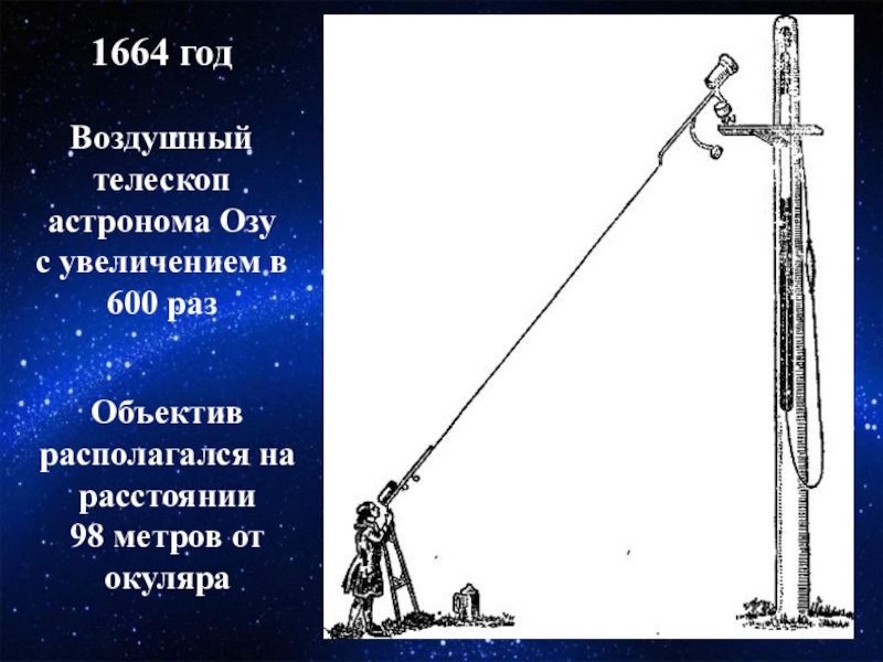 1664 год Воздушный телескоп астронома Озу с увеличением в 600 разОбъектив располагался на расстоянии 98 метров от