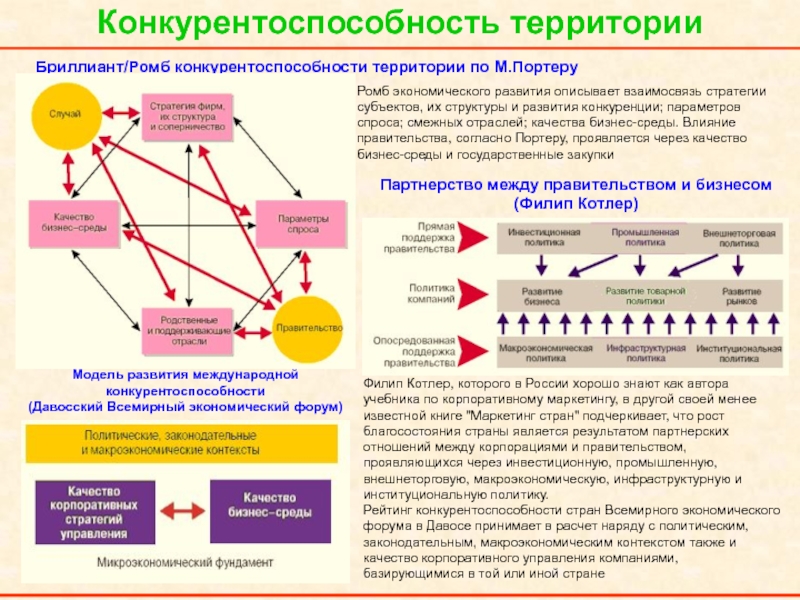 Филип Котлер, которого в России хорошо знают как автора учебника по корпоративному маркетингу, в другой своей менее известной книге "Маркетинг стран" подчеркивает, что рост благосостояния страны является результатом партнерских отношений между корпорациями и правительством, проявляющихся через инвестиционную, промышленную, внешнеторговую, макроэкономическую, инфраструктурную и институциональную политику.