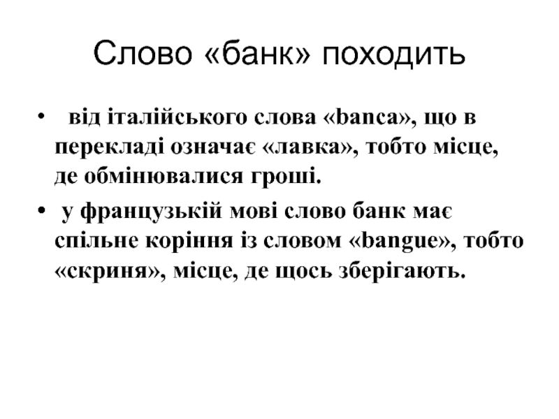 слово банк має спільне коріння із словом «bangue», тобто «скриня», місце, де щось зберігають.