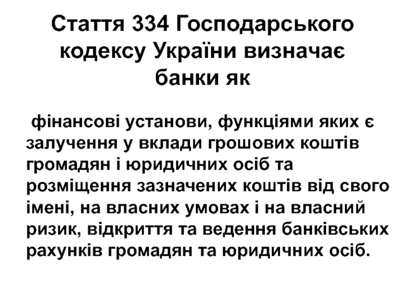 Слайд 18Стаття 334 Господарського кодексу України визначає банки як