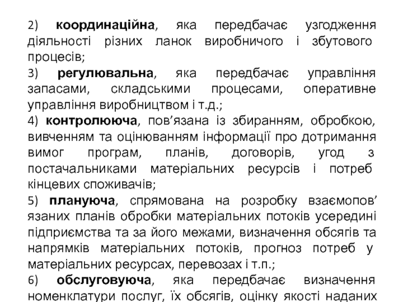 5) плануюча, спрямована на розробку взаємопов’язаних планів обробки матеріальних потоків усередині підприємства та за його межами, визначення обсягів та напрямків матеріальних потоків, прогноз потреб у матеріальних ресурсах, перевозах і т.п.;