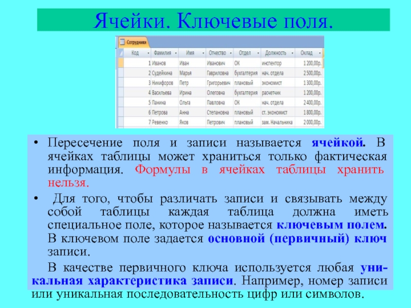 сведений определенного типа. Например, в таблице Сотрудники в поле Фамилия хранятся фамилии всех сотрудников. В поле Оклад - их зарплаты.