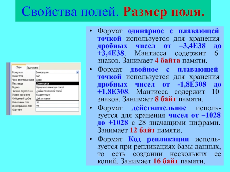 Числовой. Используется для чисел, с которыми нужно производить вычисления. Для числовых полей важно свойство Размер поля. Размер поля может быть 1, 2, 4, 8 байт в зависимости от типа числа. По умолчанию устанавливается для целых чисел –4 байта и для дробных чисел – 8 байт.