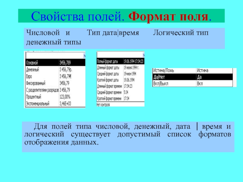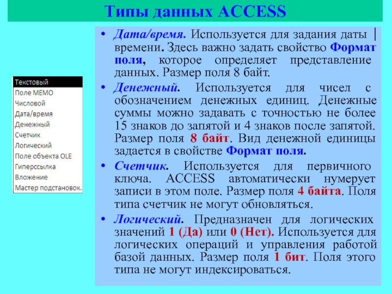 Денежный. Используется для чисел с обозначением денежных единиц. Денежные суммы можно задавать с точностью не более 15 знаков до запятой и 4 знаков после запятой. Размер поля 8 байт. Вид денежной единицы задается в свойстве Формат поля.