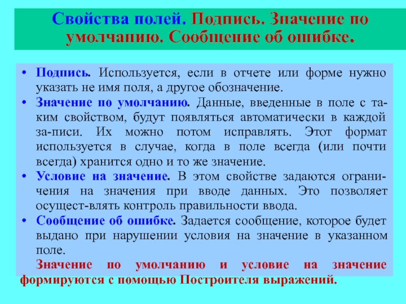 Слайд 29Свойства полей. Подпись. Значение по умолчанию. Сообщение об ошибке.