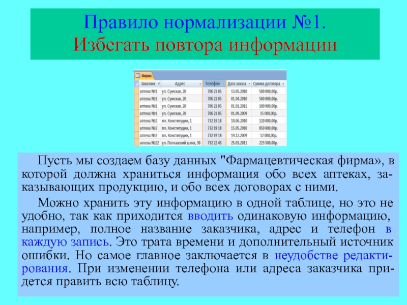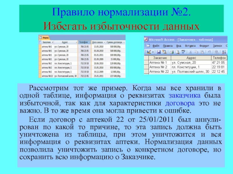 Если договор с аптекой 22 от 25/01/2011 был аннули-рован по какой то причине, то эта запись должна быть уничтожена из таблицы, при этом уничтожится и вся информация о реквизитах аптеки. Нормализация данных позволила уничтожить запись о конкретном договоре, но сохранить всю информацию о Заказчике.