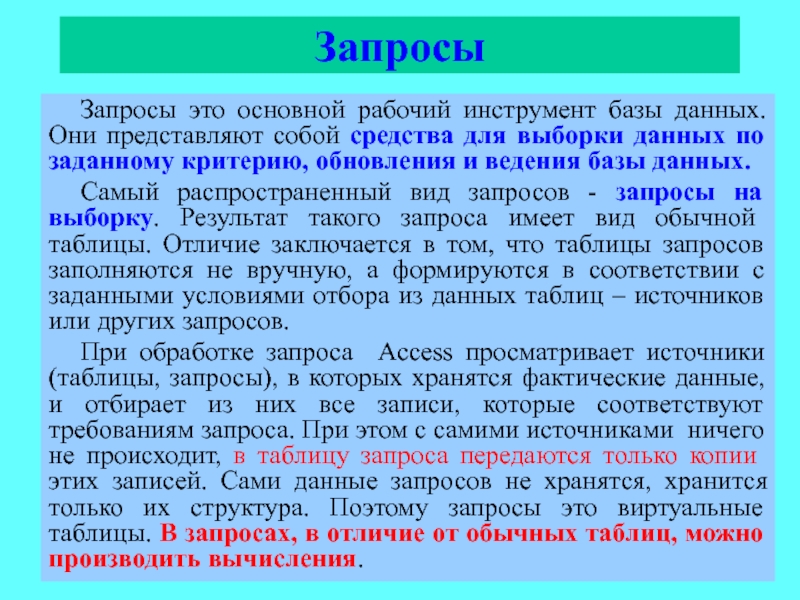 При обработке запроса Access просматривает источники (таблицы, запросы), в которых хранятся фактические данные, и отбирает из них все записи, которые соответствуют требованиям запроса. При этом с самими источниками ничего не происходит, в таблицу запроса передаются только копии этих записей. Сами данные запросов не хранятся, хранится только их структура. Поэтому запросы это виртуальные таблицы. В запросах, в отличие от обычных таблиц, можно производить вычисления.