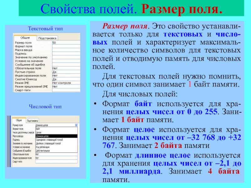 текстовых и число-вых полей и характеризует максималь-ное количество символов для