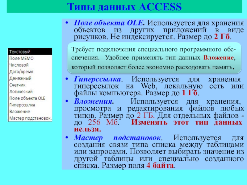 Требует подключения специального программного обе-спечения. Удобнее применять тип данных Вложение, который позволяет более экономно расходовать память.
