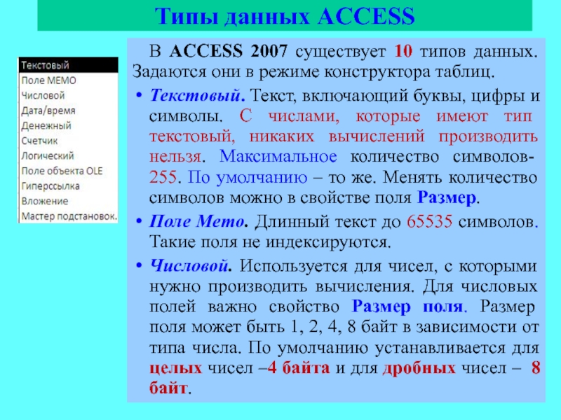 В ACCESS 2007 существует 10 типов данных. Задаются