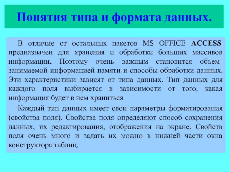 Каждый тип данных имеет свои параметры форматирования (свойства поля). Свойства поля определяют способ сохранения данных, их редактирования, отображения на экране. Свойств поля очень много и задать их можно в нижней части окна конструктора таблиц.