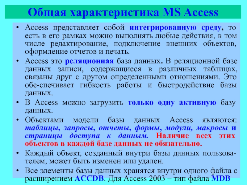 Все элементы базы данных хранятся внутри одного файла с расширением ACCDB. Для Access 2003 – тип файла MDB
