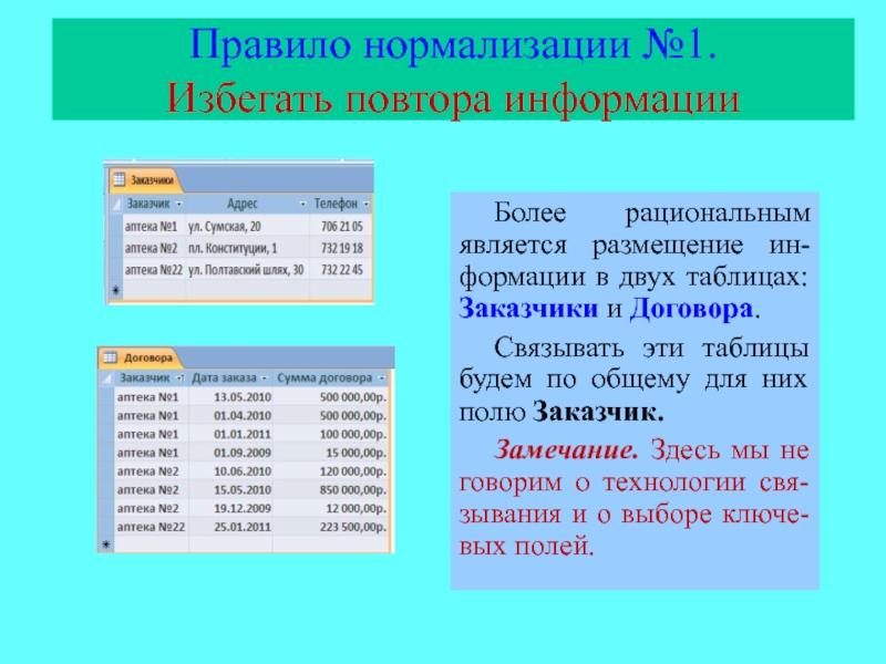 Существуют определенные правила нормализации данных. Основные из них - избегать повтора информации и избегать избыточности данных.