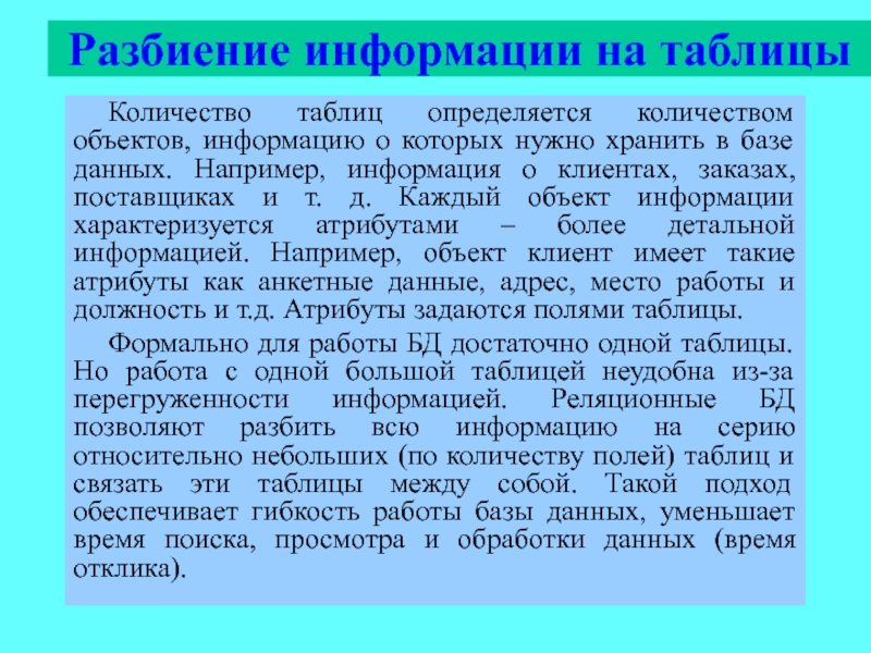 Формально для работы БД достаточно одной таблицы. Но работа с одной большой таблицей неудобна из-за перегруженности информацией. Реляционные БД позволяют разбить всю информацию на серию относительно небольших (по количеству полей) таблиц и связать эти таблицы между собой. Такой подход обеспечивает гибкость работы базы данных, уменьшает время поиска, просмотра и обработки данных (время отклика).