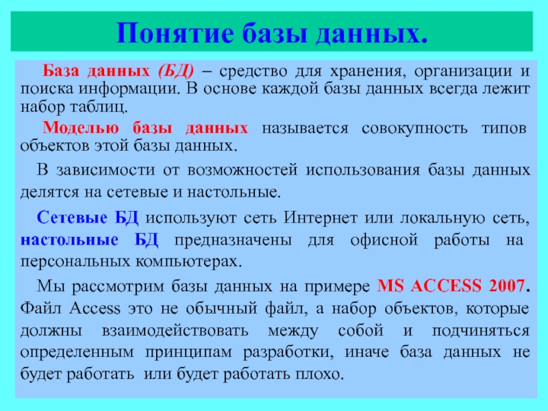 Мы рассмотрим базы данных на примере MS ACCESS 2007. Файл Access это не обычный файл, а набор объектов, которые должны взаимодействовать между собой и подчиняться определенным принципам разработки, иначе база данных не будет работать или будет работать плохо.