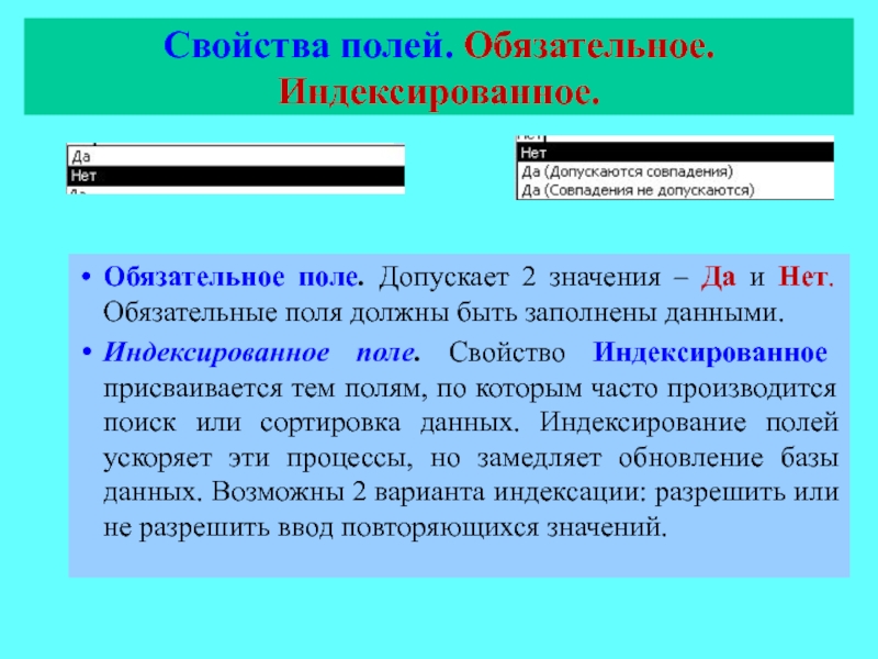 Слайд 30Свойства полей. Обязательное. Индексированное.