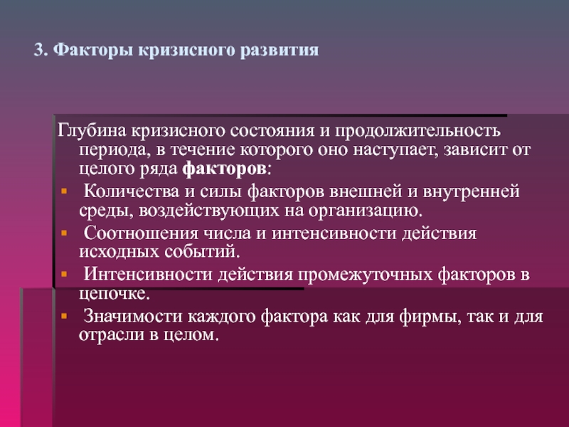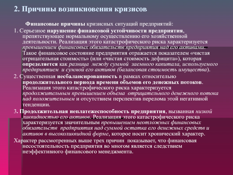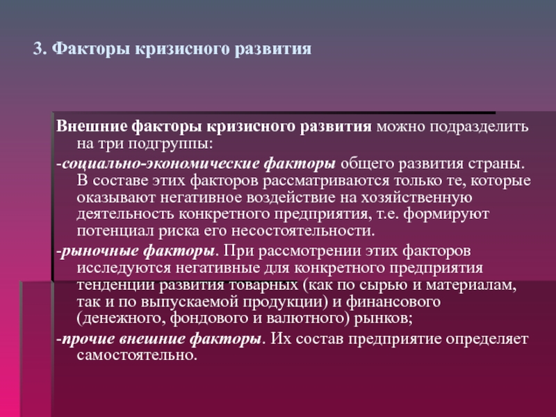 Указанные причины не являются непосредственными причинами возникновения кризиса на той или иной стадии жизненного цикла предприятия и тем более его несостоятельности. Однако они влияют на развитие факторов ухудшения финансово-экономического и хозяйственного состояния предприятия.
