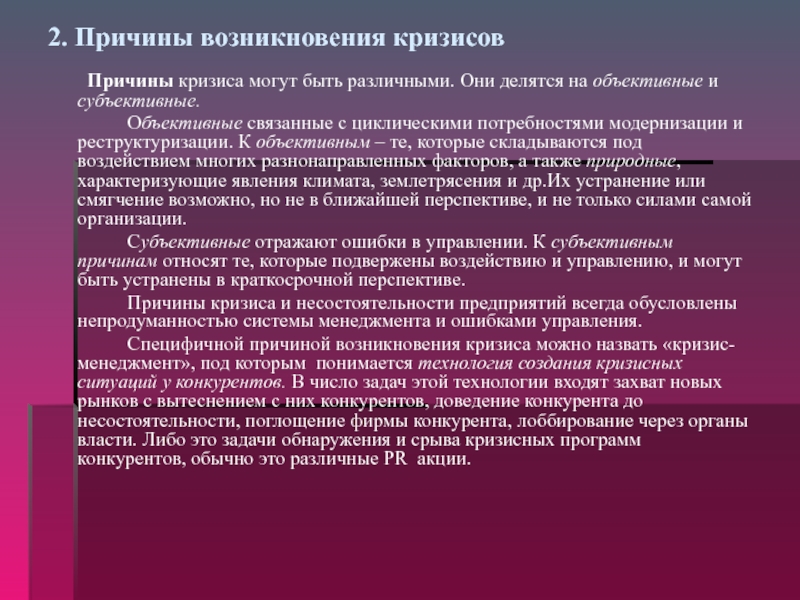 и реструктуризации. К объективным – те, которые складываются под воздействием многих разнонаправленных факторов, а также природные, характеризующие явления климата, землетрясения и др.Их устранение или смягчение возможно, но не в ближайшей перспективе, и не только силами самой организации.