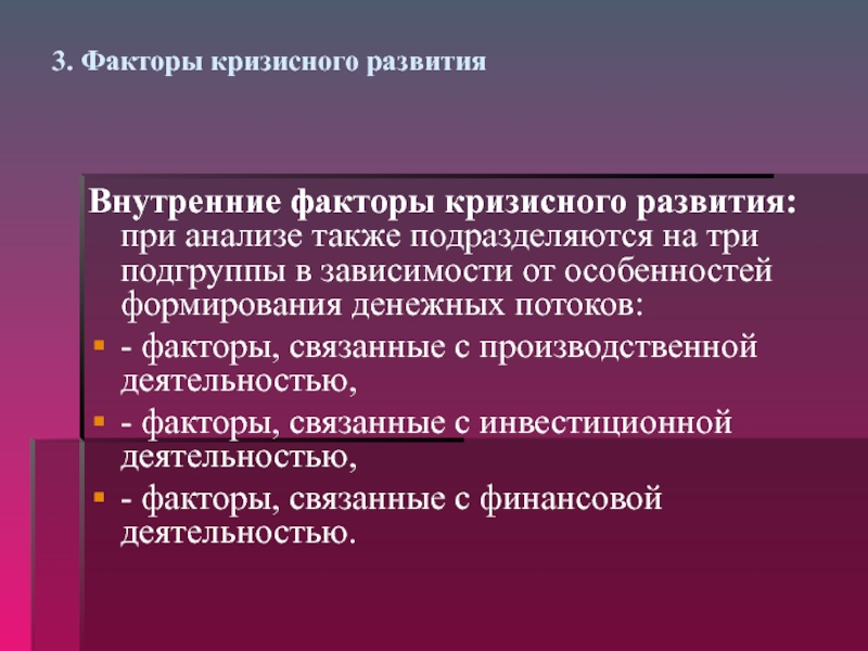 Финансовые факторы: 1.Неэффективная финансовая стратегия. 2.Неэффективная структура активов (низкая ликвидность). 3.Чрезмерная доля заемного капитала. 4. Высокая доля краткосрочных источников привлечения заемного капитала. 5. Рост дебиторской задолженности. 6.Высокая стоимость капитала. 7. Превышение допустимых пределов финансовых рисков. 8. Неэффективный финансовый менеджмент