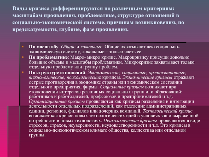 Слайд 5Виды кризиса дифференцируются по различным критериям: масштабам проявления, проблематике, структуре