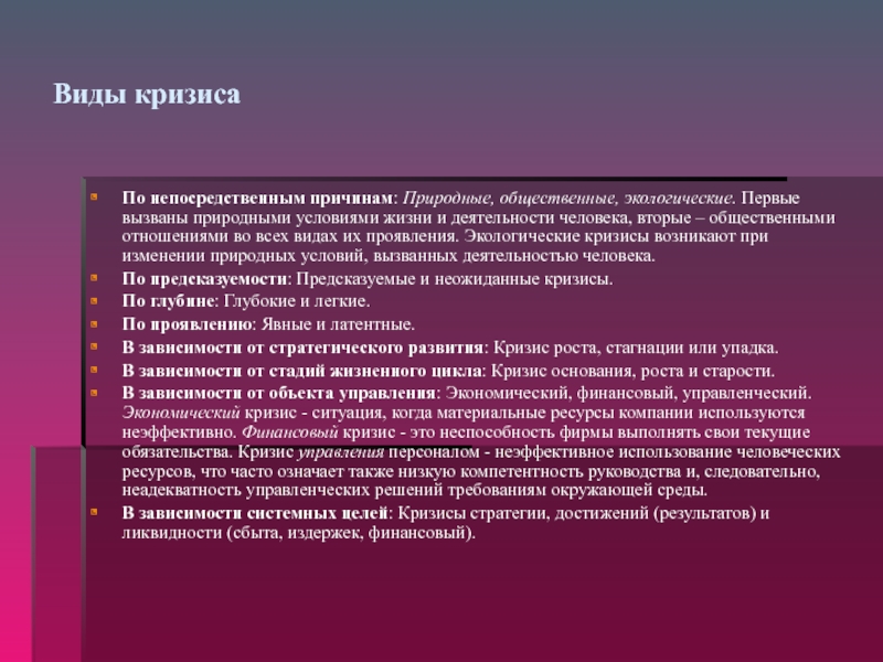 В зависимости системных целей: Кризисы стратегии, достижений (результатов) и ликвидности (сбыта, издержек, финансовый).