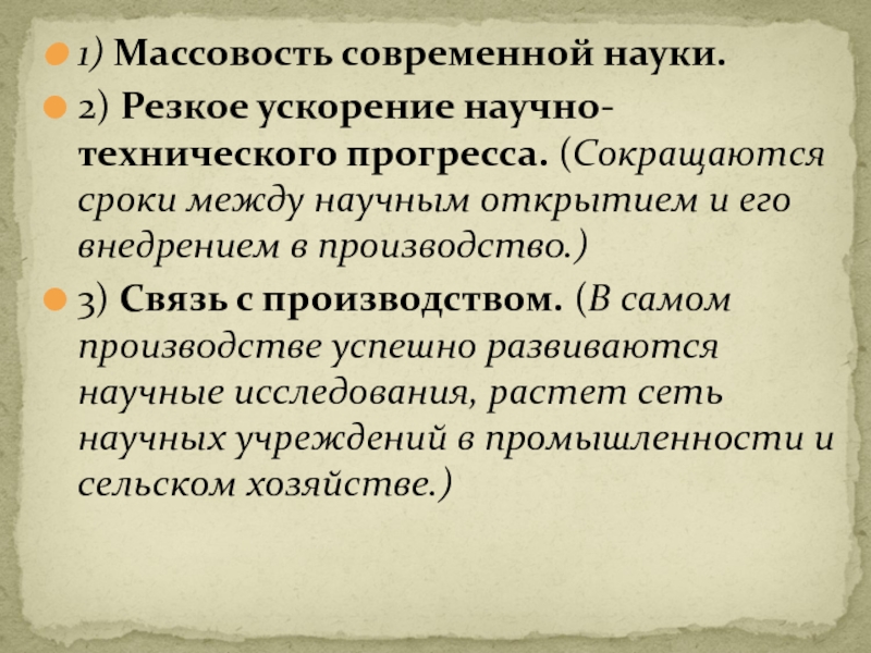 Слайд 111) Массовость современной науки.