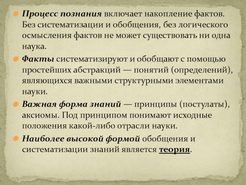 Слайд 9Процесс познания включает накопление фактов. Без систематизации и обобщения, без