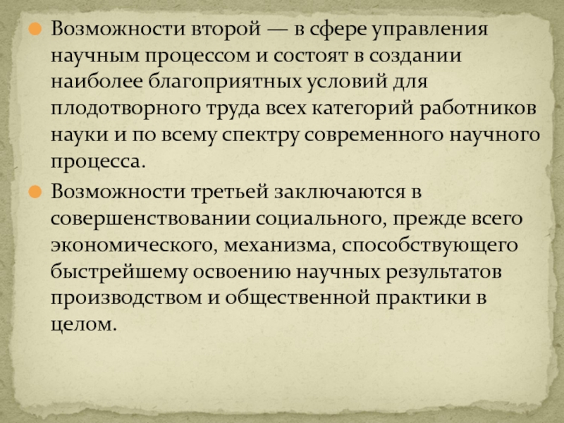 Слайд 14Возможности второй — в сфере управления научным процессом и состоят