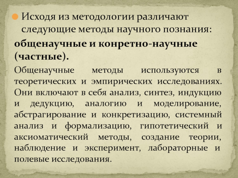 включают в себя анализ, синтез, индукцию и дедукцию, аналогию и моделирование, абстрагирование и конкретизацию, системный анализ и формализацию, гипотетический и аксиоматический методы, создание теории, наблюдение и эксперимент, лабораторные и полевые исследования.
