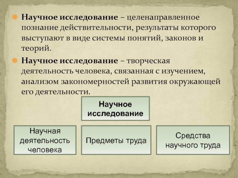 Слайд 5Научное исследование – целенаправленное познание действительности, результаты которого выступают в виде