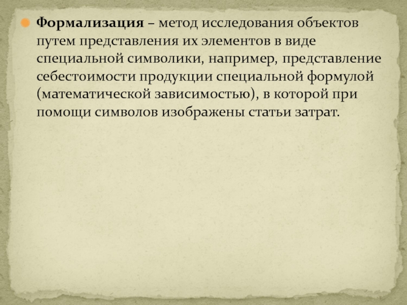 Слайд 28Формализация – метод исследования объектов путем представления их элементов в виде