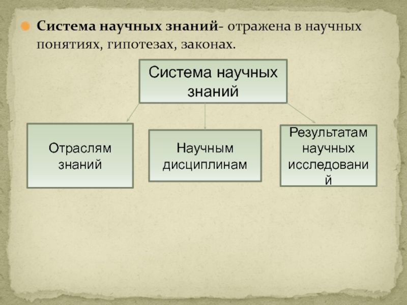 Слайд 3Система научных знаний- отражена в научных понятиях, гипотезах, законах.