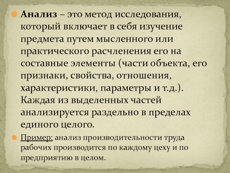 Слайд 18Анализ – это метод исследования, который включает в себя изучение предмета