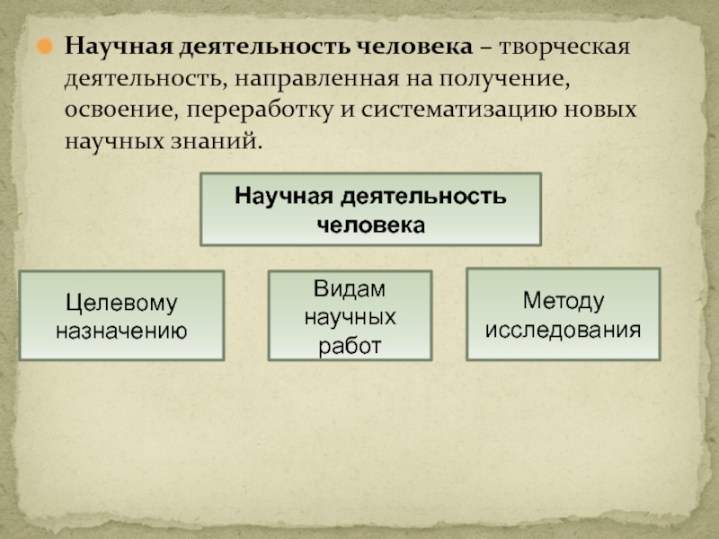 Слайд 4Научная деятельность человека – творческая деятельность, направленная на получение, освоение,