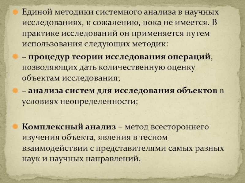 Слайд 27Единой методики системного анализа в научных исследованиях, к сожалению, пока