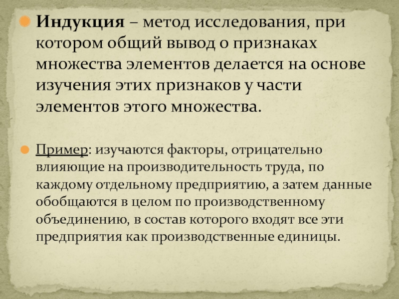 Слайд 20Индукция – метод исследования, при котором общий вывод о признаках множества