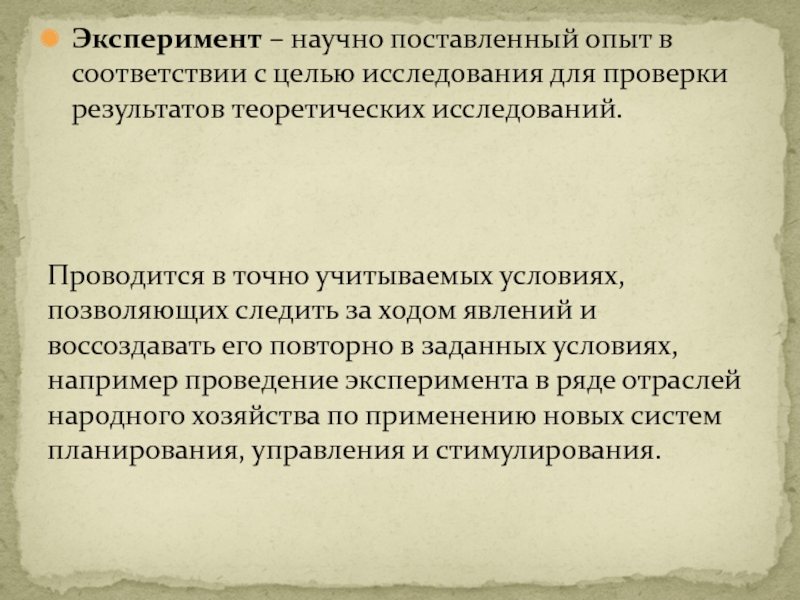 Слайд 31Эксперимент – научно поставленный опыт в соответствии с целью исследования для